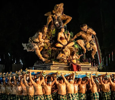 Mais la veille, il y a Ogoh-Ogoh… un moment de célébration intense de la lutte du bien contre le mal. Des monstres sont paradés dans les rues, se livrant à des combats simulés.
